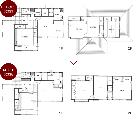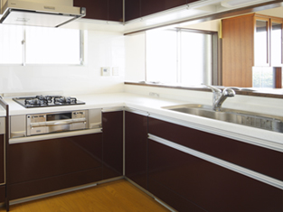 一昔前は一般的だった個室で風通しの悪い独立型キッチン。勝手口にあった前室という使用頻度の少ないスペースを新しいキッチンに取り込み、間取りを大きく変えることなく、作業スペースを広げることに成功。対面式L型キッチンへと大変身しました。