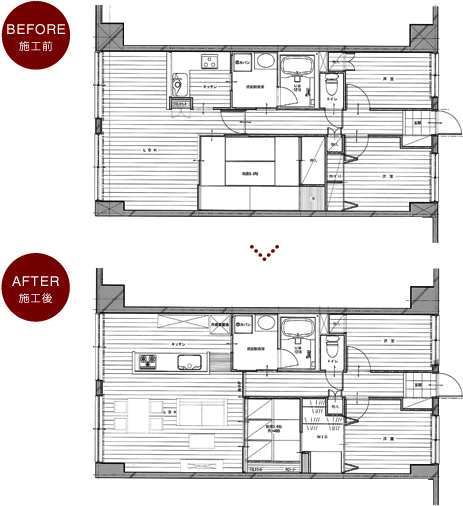 リビング横にあった出窓タイプのカウンターキッチンは、入口が非常にせまく、複数人で料理するときには動線がぶつかり合い非常に不便なもの。アイランドキッチンにすることで、両側に動線をとることができ、非常に使い勝手のよいキッチンに変身。ダクト部分をあえてむき出しにすることで、ちょっとお洒落なイタリアンレストランのような雰囲気を出しています。
