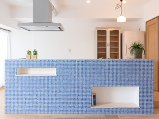 一番のこだわりはモザイクタイルのアイランドキッチン。廊下からリビングに入ると青系のモザイクタイルが一番最初に目に飛び込んできます。このお宅のシンボルでもあり、一番のお気に入りの場所でもあります。