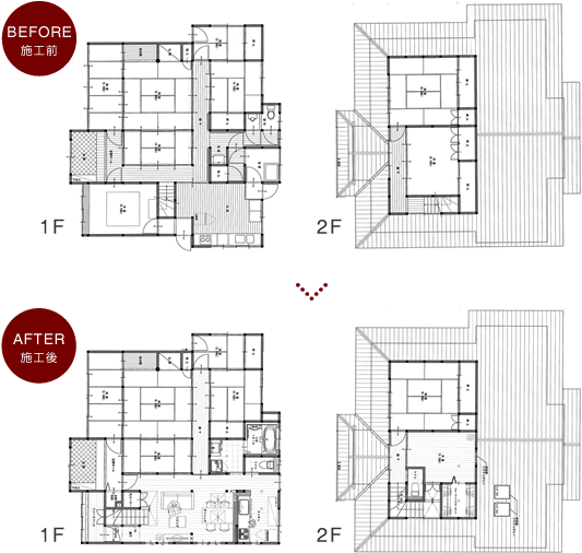 築45年のいわゆる「和風住宅」に移り住むことになったG様。親戚の方々が集まったときには続き間の和室を広々と使いたいとのご要望をいただき、大人数で集うことのできる空間を残しつつ、家族が普段使う生活空間は使い勝手のよい空間にするために、キッチン部分を増築したり、無駄になる空間は減築するというRESTILOならではの空間演出盛りだくさんのプランとなりました。