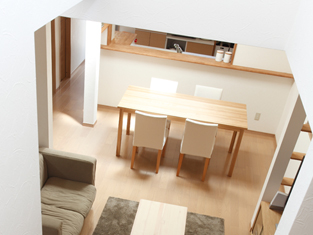 階段上部の子ども部屋には気になる窓が。子ども部屋とリビングをつなぐ窓からは、リビングを覗くことができ、風や光をリビングに届けるだけではなく、家族の気配もお互いに感じられるような設計なっています。