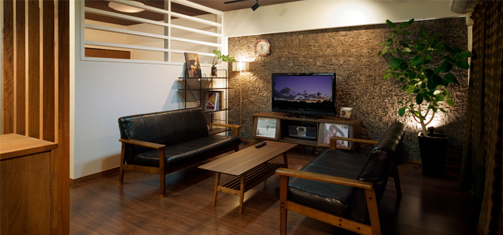 リビングの壁をタイル貼り、床をウォルナット、天井をブラウンにすることでリフォーム前のイメージをガラリと一新しました。